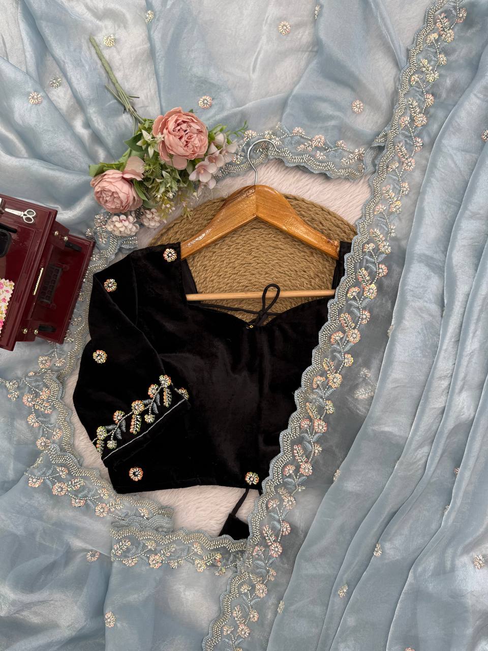 Step into timeless grace with this ethereal powder blue saree designed to bring effortless elegance to any special occasion. Crafted from soft, flowy fabric, this saree features delicate intricate embroidery along the borders and scattered motifs across the drape, creating a subtle shimmer that catches the light beautifully.