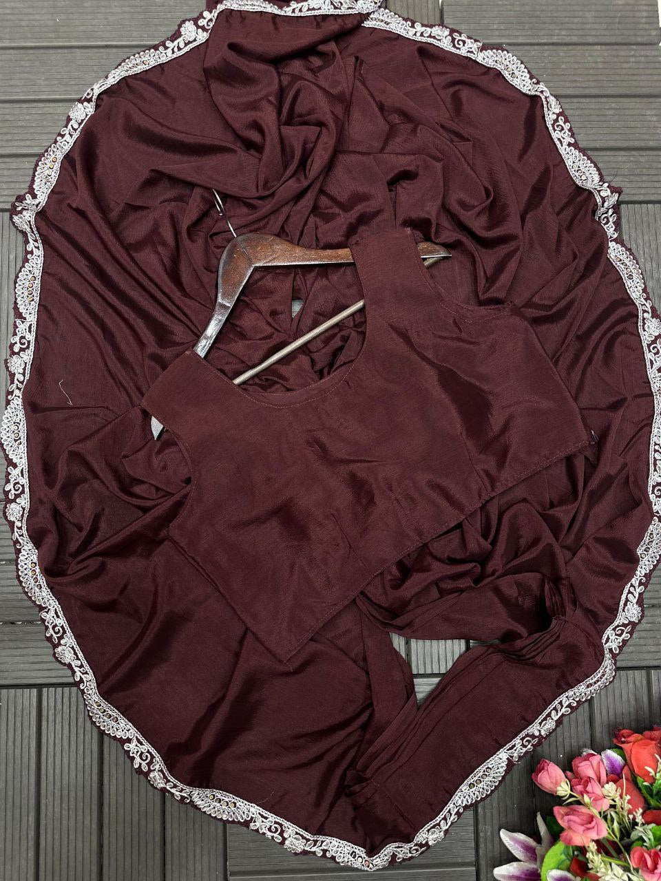 Elevate your occasion wear with this luxurious cocoa-brown draped saree set, designed for a perfect blend of modern elegance and traditional charm. Crafted in a rich, fluid fabric, the saree features a contemporary pre-draped silhouette with soft pleats that create a flattering, gown-like fall.
